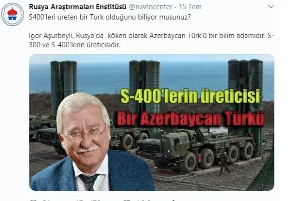 Konu ile ilgili sosyal medyadan paylaşımda bulunan Rusya Araştırmaları Enstitüsü de "S400'leri üreten bir Türk olduğunu biliyor musunuz? İgor Aşurbeyli, Rusya'da köken olarak Azerbaycan Türk'ü bir bilim adamıdır. S-300 ve S-400'lerin üreticisidir" denildi.
